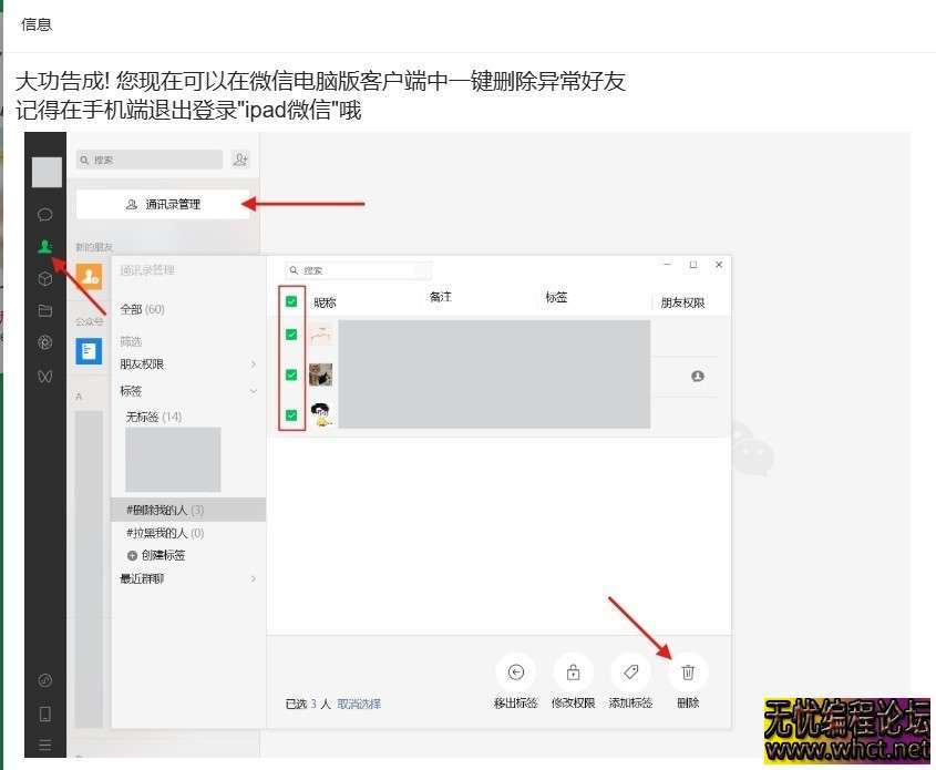 快速检测你的微信有没有单向好友,并自动将其添加到标签中(之后可在电脑端一键清除这些人),理论上可以支持检测上万的好友注意事项: [*]扫码登录时要确保在同一网络环境,否则会强制验证码确认导致无法登录 [*]您授权登 ...